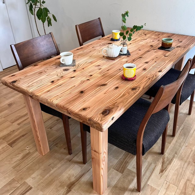 安心安全で味のある家具を製作しております『のすけ工房』です。 安心してお使い頂ける商品を一品一品丁寧に仕上げさせて頂いております。 すべて、一つ一つ受注製作をしております。 ※現在の納期は、下記のプロフィール欄をご参照下さい。 https://www.creema.jp/c/nosuke-kobo 風合い豊かで温かみのある国産杉の無垢材を使用し、全ての角を丸く滑らかに仕上げたダイニングテーブル!~木製脚~ 四つ脚バージョンのダイニングテーブル! 天板、脚共に国産杉材を使用。 脚の角も滑らかに仕上げ、足あたりも柔らかです。 ◆天板 国産杉の無垢材を丁寧につなぎ、あじのある一枚の天板に。 天板の厚みはベースが24mmに対し縁取りは全面48mmと厚みを持たせ 重厚感がありながら、重くなりすぎないダイニングテーブルです♪ 天板の外周角部分から脚の部分まで全ての角を丸く仕上げ、お子様も安心してご利用頂けます。なめらかな仕上がりと安全面を考慮し角の研磨は全て手作業で行っています! 杉材は節のあるものを使用しております。 節の抜け部分は職人が丁寧に埋めて平らに仕上げております。 節が自然のアクセントになり、木材らしい風合い豊かな雰囲気に♪ 尚、柔らかい肌触りで木目も綺麗な杉材ですが、傷もつきやすい材木になります。 長く使っていただく中で、お客様の生活の跡と考えて頂き、味わいとして楽しんでいただければ幸いです。 ◆脚 テーブル側面にも椅子を置いて使用したい、よりすっきりしたデザインがお好みのお客様のために、四つ脚タイプのダイニングテーブルになります。 脚の形は、1つの脚に対し4箇所をネジで固定致します。 仕上げも天板同様、亜麻仁油でオイルフィニッシュとなっております。 また、脚の角部分もしっかり面取り加工しておりますので、座っている時に足が当たっても柔らかいあたりにしております。 天板と脚は商品到着後、お客様ご自身で組み立てて頂きます。プラスドライバーのみご用意下さい。 口脚やT字脚など類似商品はこちら↓ https://nosukekobo.thebase.in/items/56727955 ◆サイズ 横幅150㎝×奥行き80㎝×高さ69.5㎝ ◆サイズオーダー可能!(最大横幅180㎝まで) 一人暮らしサイズから家族サイズまでサイズの変更が可能です。 ・横幅150cm未満 +¥0 ・横幅150cm +¥0 ←写真掲載サイズ ・横幅160cm +¥3500 ・横幅170cm +¥7000 ・横幅180cm +¥10500 奥行の変更も可能です! 横幅、奥行、高さそれぞれお好きなサイズをお知らせ下さい。 ◆カラーオーダー +¥0 お子様がいらっしゃるご家庭でも安心、天然由来のもの使用! 天板と脚それぞれ、下記リストからお好みの色合いをお選び下さい♪ 尚、他の色をお好みのお客様もお気軽にご相談下さい。 ~天板カラーリスト~ ・クリア ←写真掲載カラー ・ミディアムウォルナット ・ダークウォルナット ・チェリー ・エボニー ・ドリフトウッド 詳しい色の違いはこちら↓ https://nosukekobo.thebase.in/items/76286134 ◆天板の仕上げ 基本は、撥水性能があり且つ、肌触りの良いオイルフィニッシュにしております。 木材の経年変化や傷や汚れなども、味わいとして楽しみたいという方にお勧めです。 コップの輪ジミや調味料の色移りなどを避けたいというお客様には、風合いや手触りは変わりますが、つや消しのウレタンコートもオススメしております(別途料金)。いずれの場合も、ランチョンマットやコースターなどをうまくご活用頂き、熱いものや濡れたものが直接触れないようご注意ください。 仕上げ方法やそれぞれのメンテナンス方法についての詳細は以下をご参照下さい。 https://nosukekobo.thebase.in/items/76286134 ◆お願い ご購入前に下記リンクの『ご購入前に知っておいて頂きたいこと』を必ずご一読下さい。 https://nosukekobo.thebase.in/items/76286259 ◆送料 ヤマト大型家財便 送料はCランクの料金が適応。(★天板サイズ2辺合計230㎝まで) それ以上の場合はDランクになります。 その他、ご不明点、ご相談等ございましたらお気軽にお問合せください♪