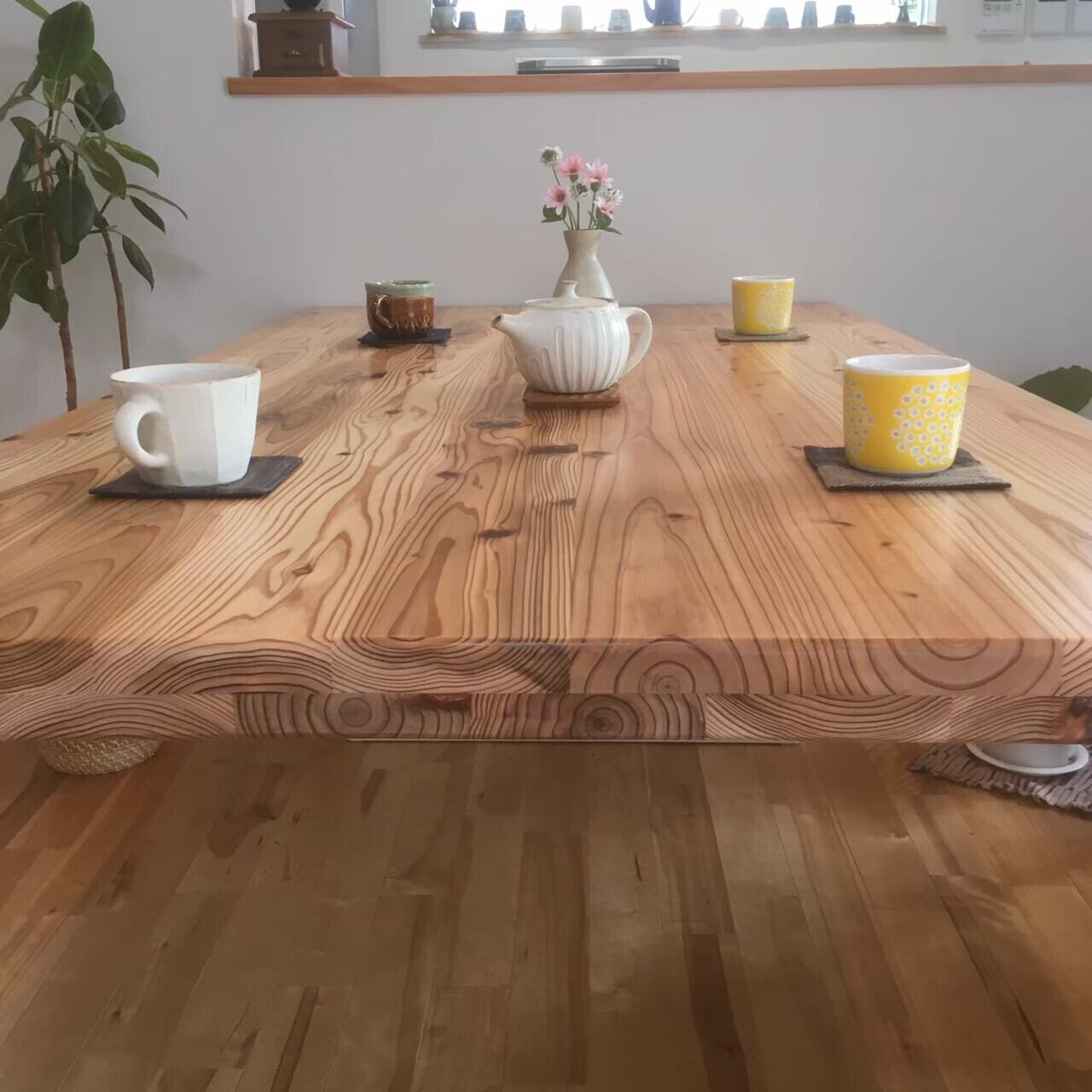 コップの輪ジミや調味料の色移りなどを避けたいというお客様には、風合いや手触りは変わりますが、つや消しのウレタンコートもオススメしております(別途料金)。いずれの場合も、ランチョンマットやコースターなどをうまくご活用頂き、熱いものや濡れたものが直接触れないようご注意ください。