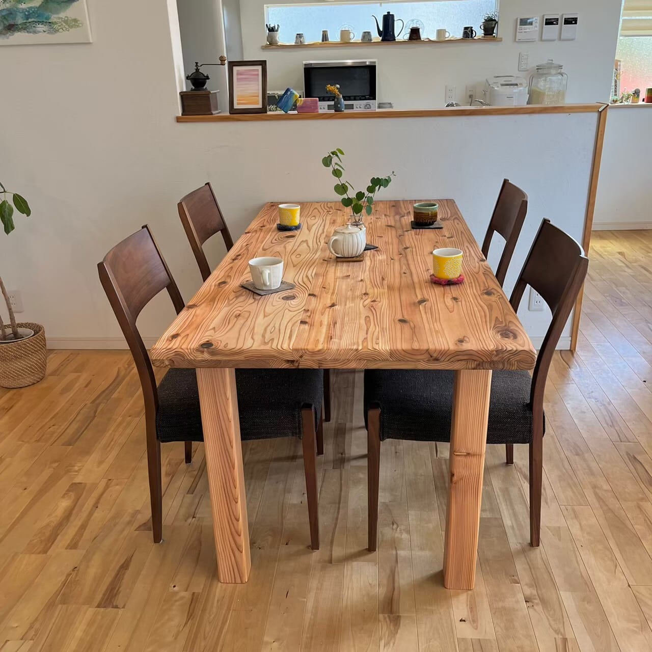 風合い豊かで温かみのある国産杉の無垢材を使用し、全ての角を丸く滑らかに仕上げたダイニングテーブル!~木製脚~